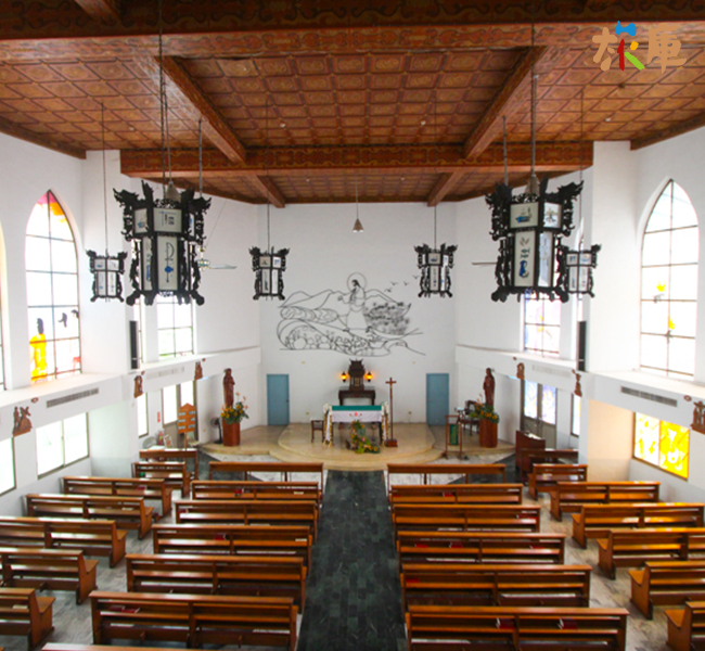 彰化景點田中聖心天主堂是由一位獲得台灣建築成就獎,也被譽為「台灣第一女建築師」的修澤蘭設計,融合中式宮殿的墨綠色琉璃瓦屋頂,屋脊尾端處有閩式建築用的吉祥裝飾,結合簡潔弧形建築體,搭配西方教堂彩繪玻璃,成為多元複合式建築。