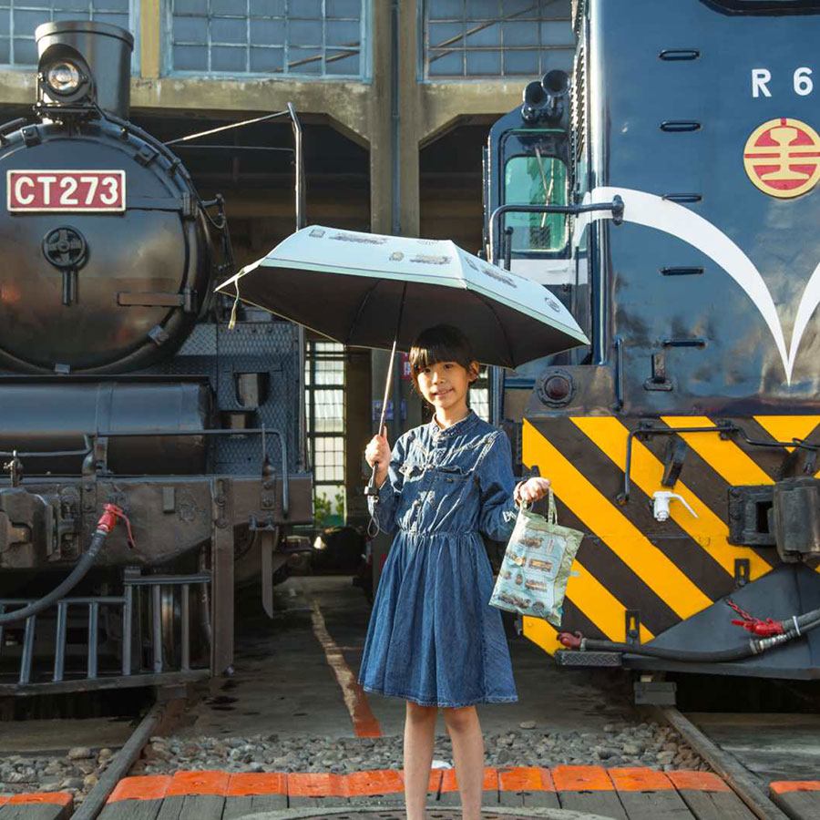 圖面以車頭與車身為主,規劃出台灣幾個重要的火車樣貌,並以扇型車庫專屬的圖騰、車票、標題等設計,圍繞在傘面上,象徵扇型車庫的包容以及長久的歷史線。