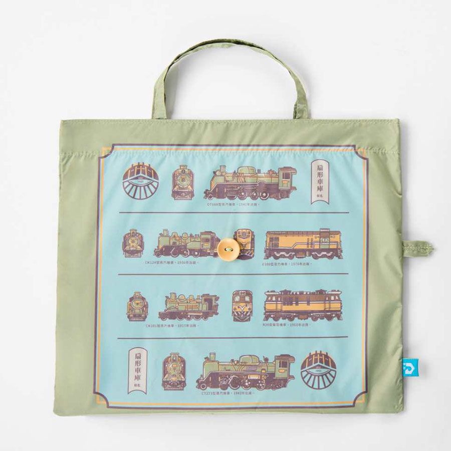 防水提袋上則已是平均分布的方式排列火車圖案,以圖鑑的方式讓大家認識各種不同的火車樣貌,是專屬於彰化扇型車庫百年的重要紀念品。