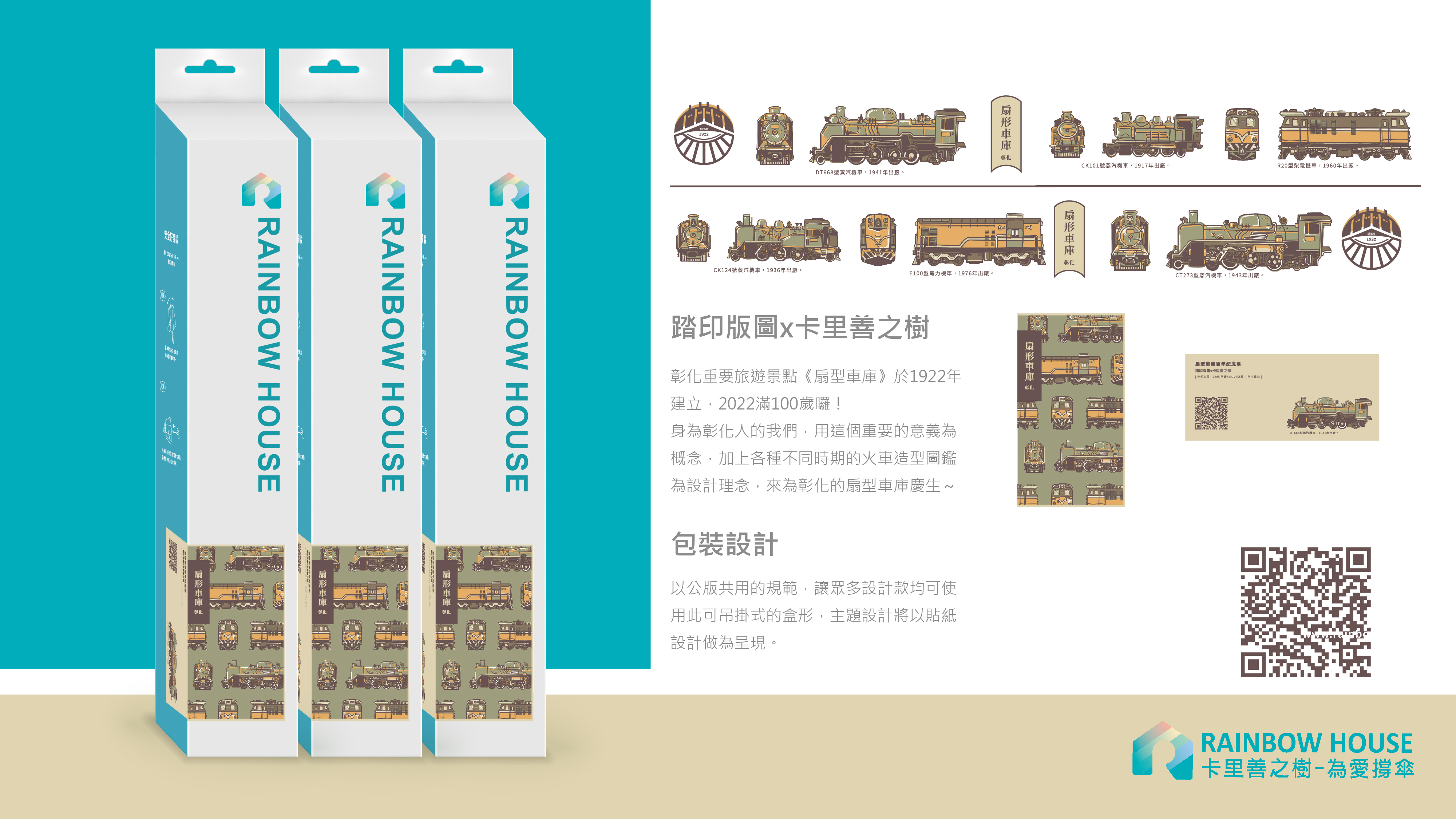 彰化重要旅遊景點扇型車庫於1922年建立,今年滿100歲 身為彰化人的我們,用這個重要的意義為概念,加上以各不同時期的火車造型圖鑑為設計理念,為彰化的扇型車庫慶生